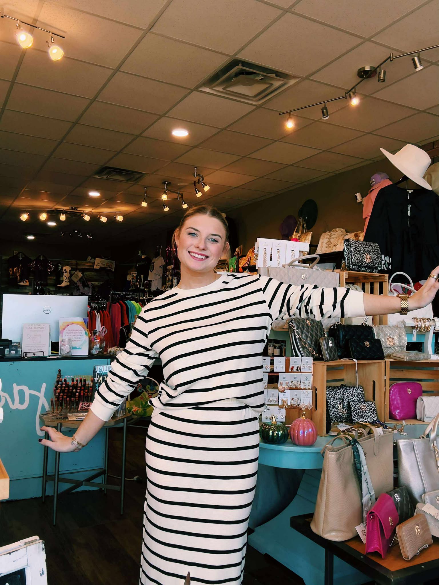 Stripe Button Cuff Top & Midi Skirt 2pcs Outfit