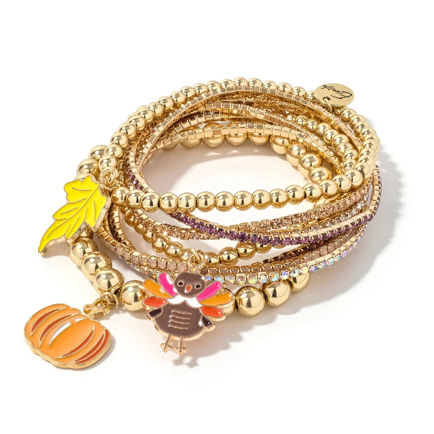 Celebrate the season with this playful fall bracelet stack featuring charming turkey, leaf, and pumpkin accents. Each piece sparkles with festive energy, making it the perfect accessory to add a touch of autumn fun to your outfit. Cozy, cute, and full of seasonal spirit!