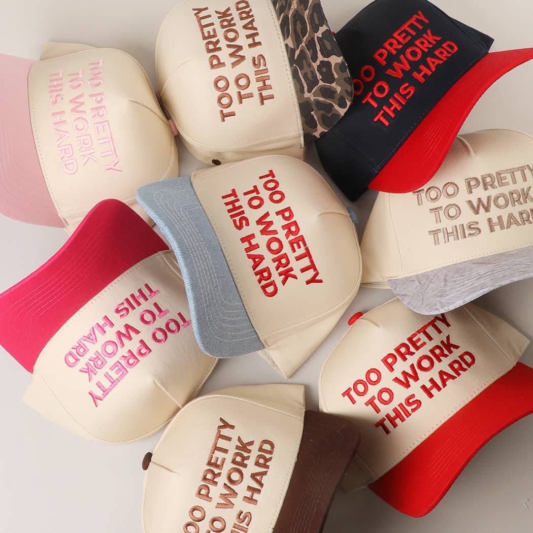 Make a bold statement with the “TOO PRETTY TO WORK THIS HARD” cap. Featuring eye-catching embroidery across the front, this playful and confident design pairs perfectly with casual outfits. The cap is made from durable material and designed with a structured front panel, curved brim, and adjustable back strap for a comfortable fit. Offered in a variety of lively color combinations — including leopard print, denim, and vivid contrasts — there’s a style for every personality. Whether you're dressing up for errands or a casual hangout, this cap adds a fun, empowering touch to any look.