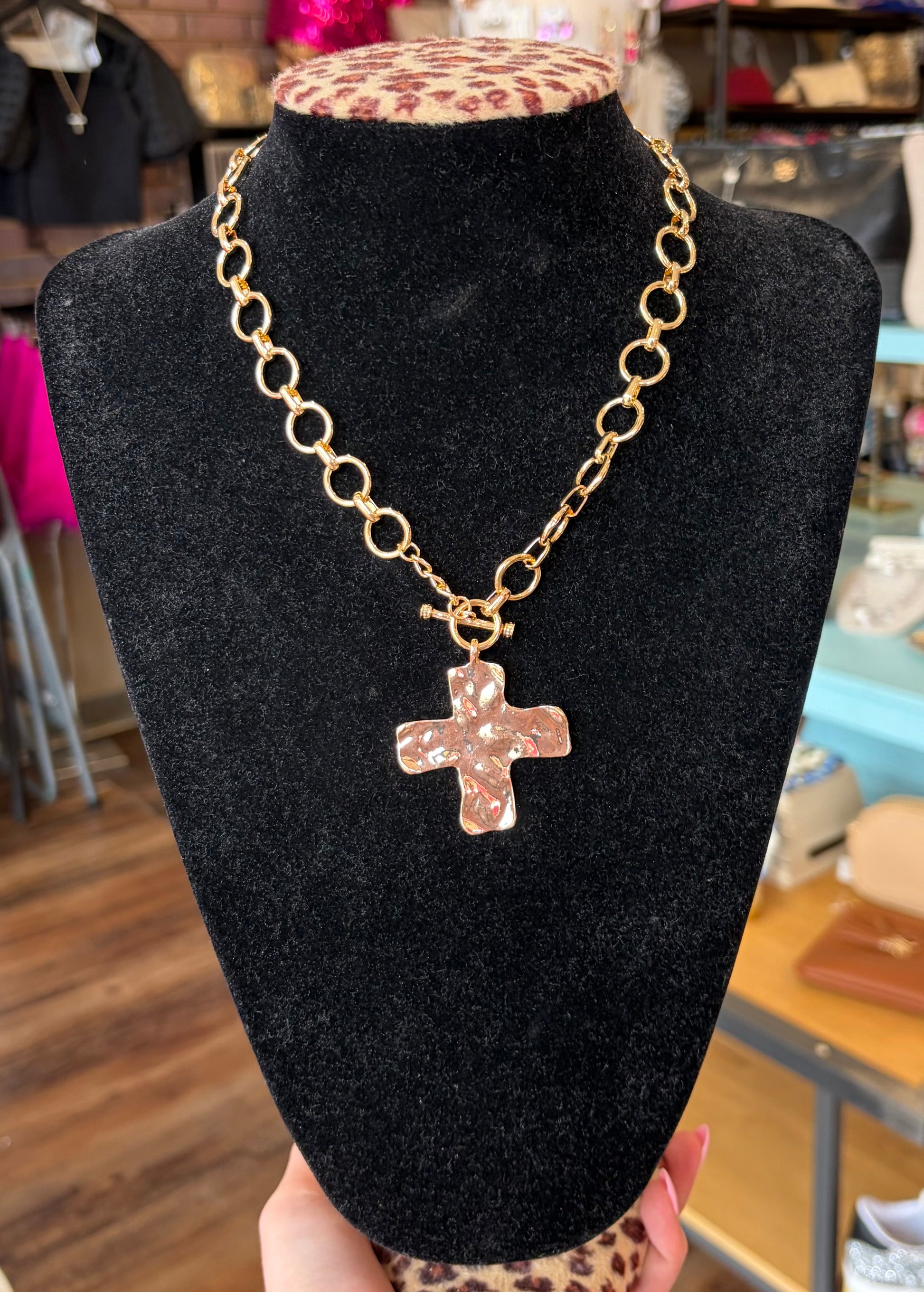 Notable Hammered Cross Front Toggle Necklace is a bold and elegant statement piece with a touch of artisanal charm. Featuring a striking hammered cross pendant, this necklace showcases a textured, handcrafted look that adds depth and uniqueness. The front toggle closure not only ensures easy wear but also enhances the design with a modern touch. Product details length: 18" clasp: Toggle metal finish: Gold Plated product: Lead & Nickel Compliant anti-tarnish: Double E-coating