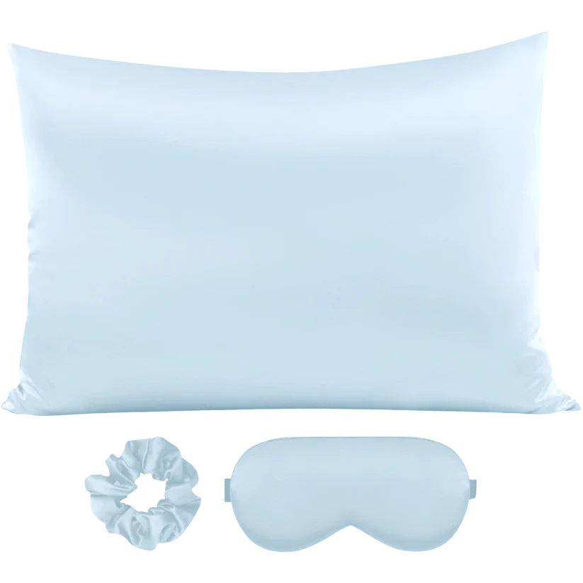 Our Satin Sleep Set comprises of an exquisite standard pillowcase with a zipper closure, a sleep mask adorned with an adjustable strap, and a glamorous satin Scrunchie.