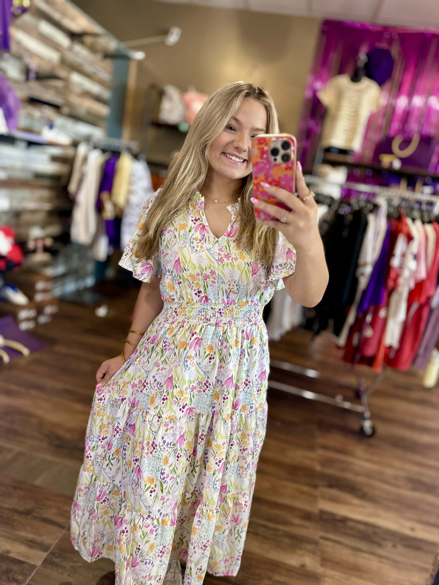 FRILL HEM NOTCH NECK PUFF SHORT SLEEVE FIT AND FLARE SMOCKED WAIST MAXI LENGTH TIERED FLORAL PRINT WOVEN DRESS WITH SIDE POCKETS