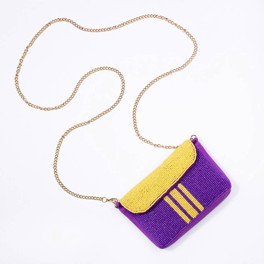 Introducing the Gameday Stripe Beaded Mini Purse in a vibrant Purple/Yellow color combination. Measuring 4x6 inches, this stylish accessory adds a touch of elegance and fun to any outfit, making it the perfect choice for game days or any special occasion.
