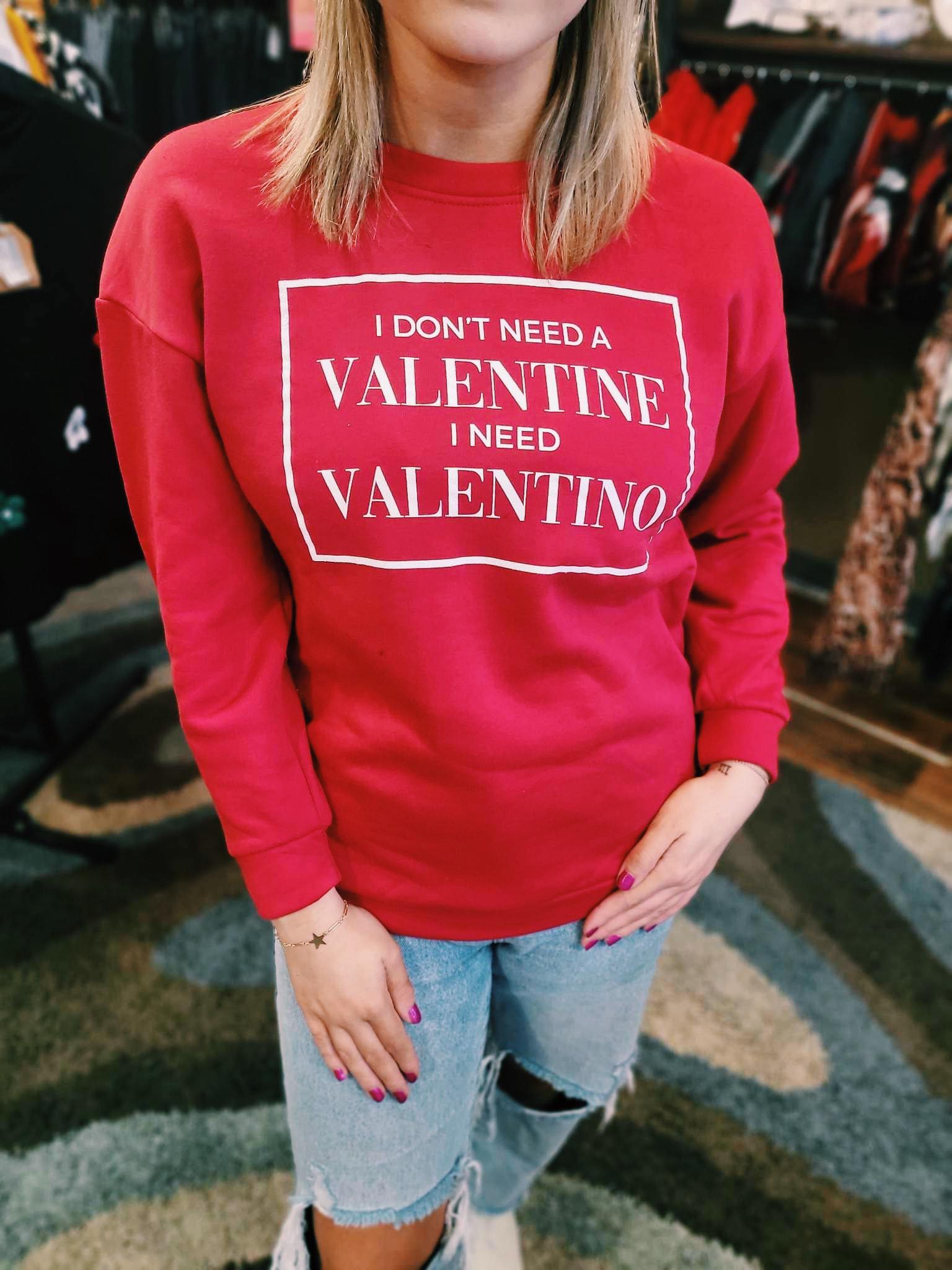 -T2D Private Label 60% cotton, 40% polyester red sweatshirt. -Design features I don't need a Valentine I need Valentino. Printed in white ink. -Sizing Hint For adult we suggest ordering your regular t-shirt size for a roomy fit, but please refer to sizing charts available online to best determine the size for you. -Care Instructions Machine wash cold. Do not bleach. Tumble dry medium. Do not dry clean.